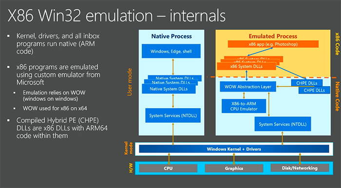 焦点、驱动及内部法式都是运转正在ARM原生模式下的,X86法式通过WOW窗口模式运转