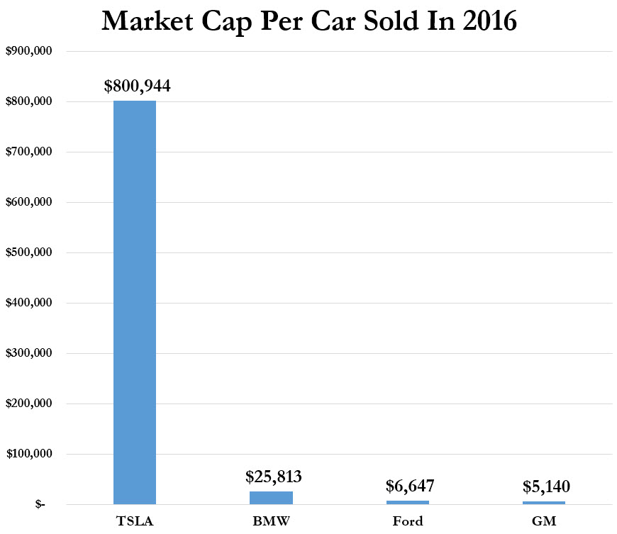 若是将市值摊到客岁出售的每辆车身上,市场对特斯拉一辆车的估值高达80万美元。