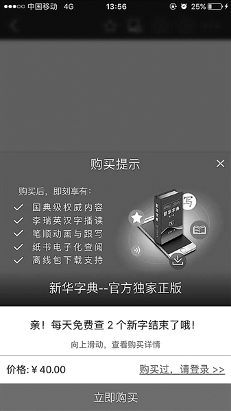 但免费版APP每天只能查询2个汉字的却惹起了争议。青年报记者发觉,正在查询2个字后,APP便弹出提醒要求采办完整版,采办费用为40元,并称采办后能够享有纸版《新华字典》第11版的完整精确内容;汉字发音播读;汉字的规范笔顺动画演示;纸书完整阅读体验;离线包下载支撑等功能。