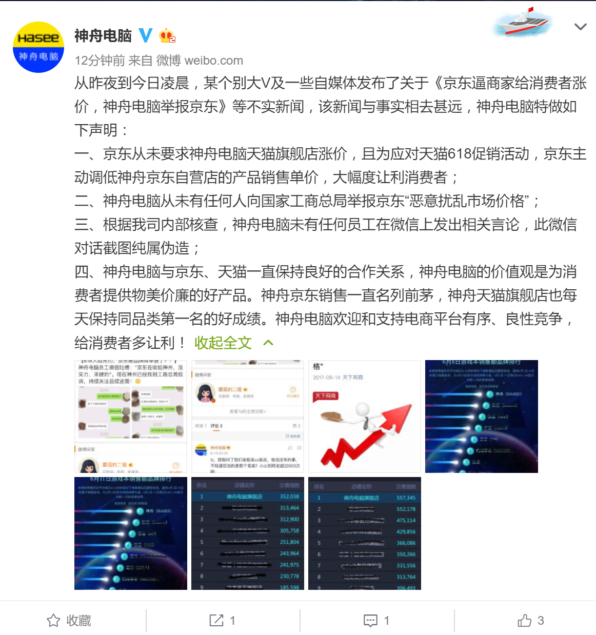 ¡¡¡¡¶Ô´Ë£¬¾©¶«³ÆÉñÖÛ½ñÌìÒÑͨ¹ýÆä΢²©£º1¡¢¾©¶«´ÓδҪÇóÉñÖÛµçÄÔÌìèÆì½¢µê½µ¼Û£¬ÇÒΪӦ¶ÔÌìè618´ÙÏú£¬¾©¶«×Ô¶¯µ÷µÍÉñÖÛ¾©¶«×ÔÓªµêµÄ²úÎï·¢Âôµ¥¼Û£¬´ó·ù¶ÈÈÃÀûÏû·ÑÕߣ»2¡¢ÉñÖÛµçÄÔ´ÓδÓÐÈκÎÈËÏò¹ú¶È¹¤ÉÌ×ܾ־ٱ¨¾©¶«“¶ñÒâÊг¡¼ÛÇ®”£»3¡¢°´ÕÕÎÒ˾ÄÚ²¿ºË²é£¬ÉñÖÛµçÄÔδÓÐÈκÎÔ±¹¤ÕýÔÚ΢ÐÅÉÏ·¢³öÏà¹ØÑÔÂÛ£¬´Ë΢ÐŶԻ°½ØÍ¼´¿ÊôÎ±ÖÆ¡£