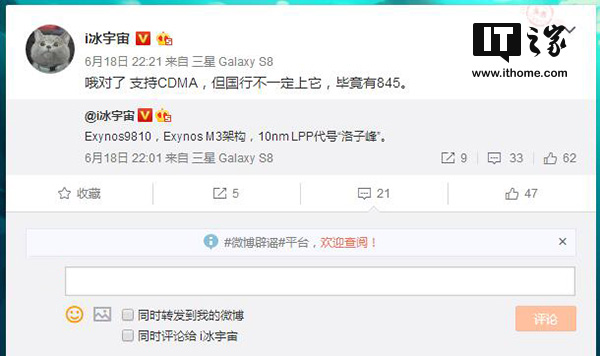 多次爆料三星处置器的微博用户i冰近日又了一款相关于三星下一代旗舰处置器的动静。按照冰供给的动静,三星的下一代处置器名字叫做Exynos9810,采用的是自从Exynos M3架构,工艺制程为10nm lpp,三星内部的代号为“洛子峰”。