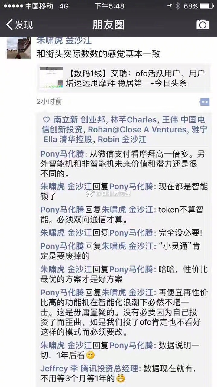 网易科技讯6月19日动静,腾讯马化腾(腾讯投资摩拜)和金沙啸虎(ofo投资人)因摩拜和ofo谁前景更好,二人正在伴侣圈互怼了起来。