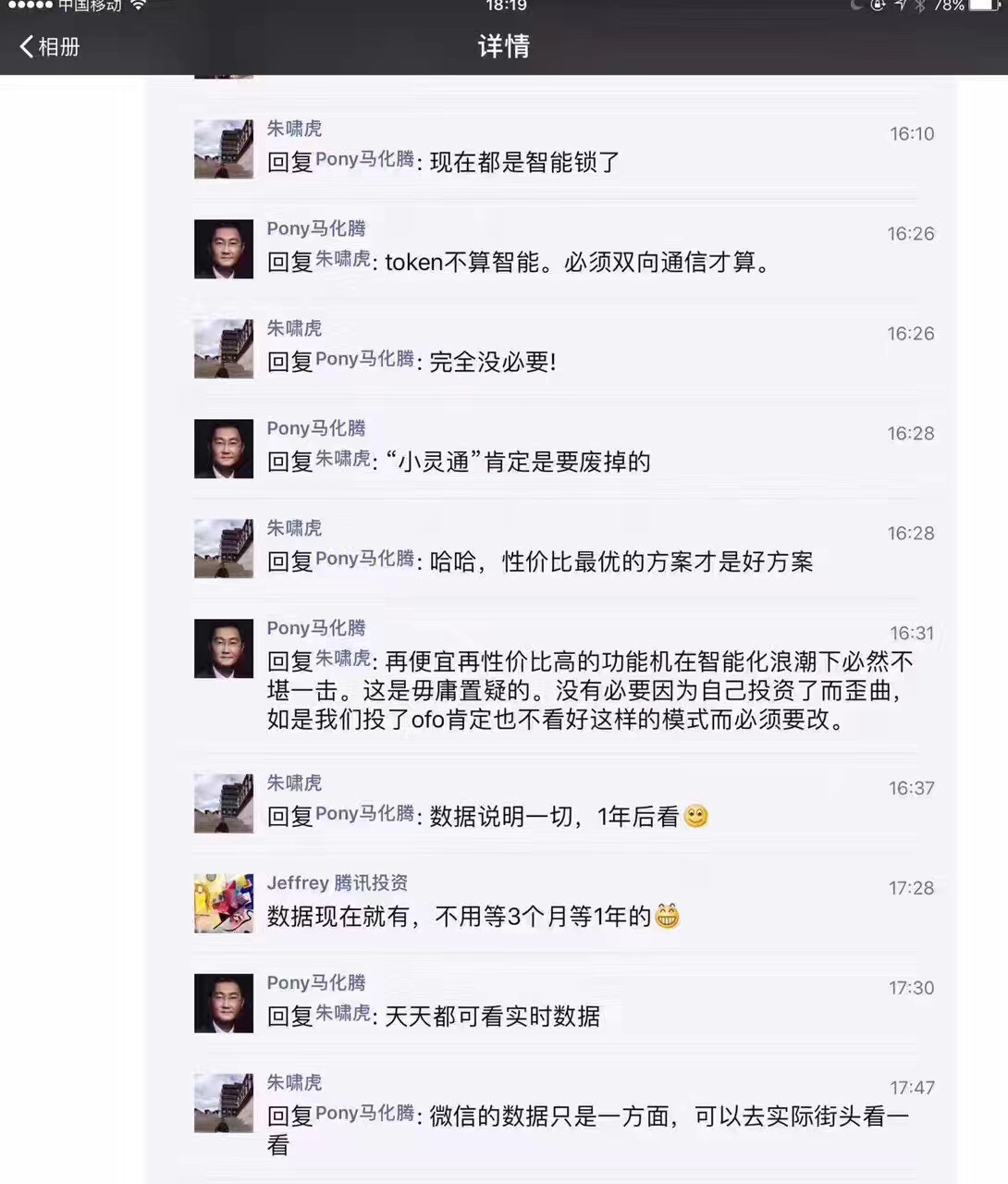 据悉,朱啸虎正在伴侣圈中发布了一组ofo最新数据,显示ofo甩敌手摩拜成为行业第一。对此马化腾立即颁发评论,先是援用微信数据,称这个不脚以信,后又转到公共比力关心的智能锁。马化腾指出ofo智能锁只能算是,不克不及匹敌摩拜的智能机。为此朱啸虎答复称数据申明一切,商定一年当前当作果。
