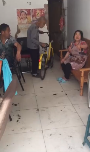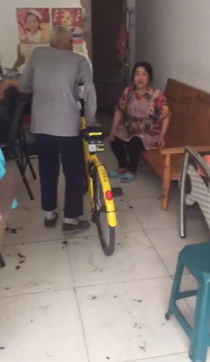 女子继续劝阻:“这是我们扫的……”“这是共享的,这不是你的车…”然而车曾经被白叟推到了房子最里面。