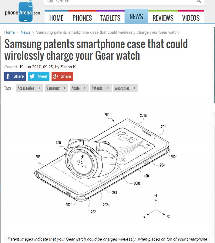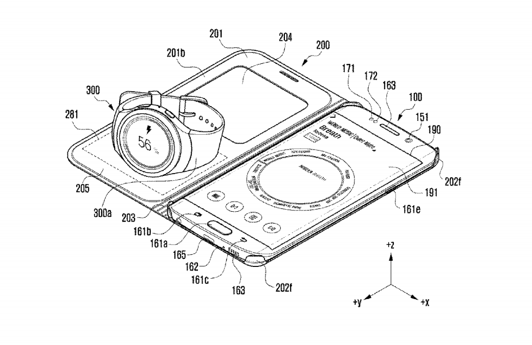 据外媒phonearena报道,美国专利商标局正在客岁12月接到了一份三星的专利申请。这张专利图了一项将来智妙手机的无线充电方案,即用户能够利用该外壳为Gear智妙手表无线充电,猜测该手艺还将支撑其它一些设备。