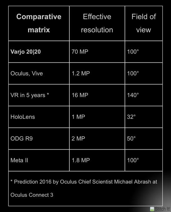 图中展现了 Varjo 原型机和其他 VR 头显的对比数据