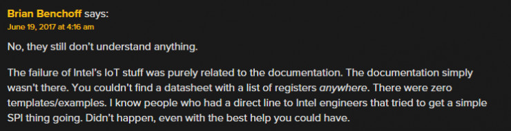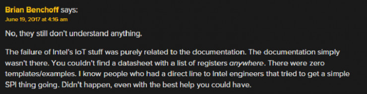 一位ID为Brian Benchoff的网友则认为,英特尔的失败次要归因于它的开辟板贫乏申档。另一位ID为finfihlman暗示,他说道:“我找了又找,可是连一张申明每个pin代表什么、它正在开辟板的哪个的图片都没有找到。”