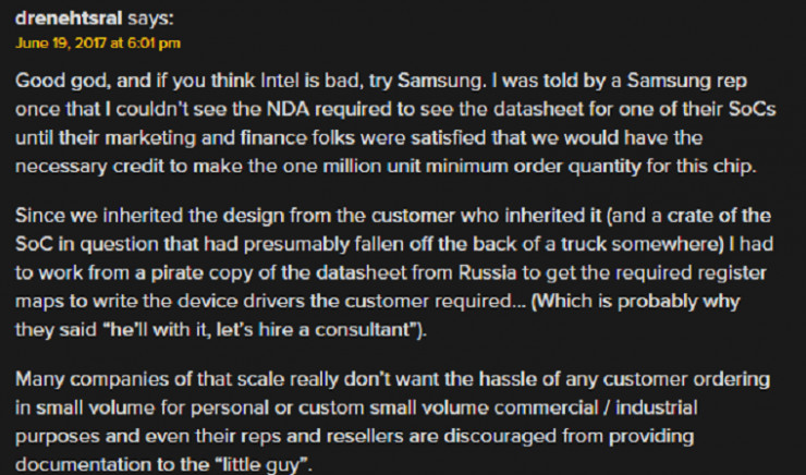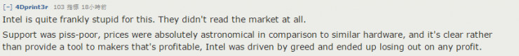 一位ID为4Dprint3r的网友暗示:坦率地说,英特尔十分笨笨,他们底子看不懂市场。取雷同的硬件比拟,他们供给的支撑少得可怜,价钱倒是天文数字。显而易见,英特尔的目标并不是向开辟者供给东西,而是借此盈利。
