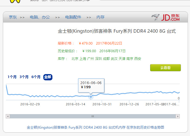 用比价东西对比了下,京东上这款金士顿8GB DDR4-2400内存客岁6月份的价钱一曲正在199元盘桓,现正在的价钱是479元,涨幅跨越一倍多。目前仍是能找到一些售价正在400元内的8GB条,可是大大都8GB内存条的价钱都正在400元以上了,一年来售价差不多就是翻倍了。