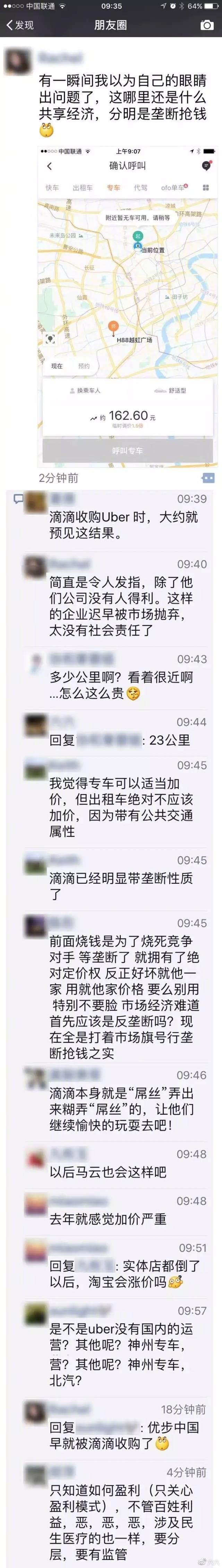 做家六六昨晚22点发布微博文章《滴滴这种企业存正在的来由是什么?》滴滴做死搞垄断抢钱,称本人和伴侣利用滴滴搭车经常碰到加价,“它不加价的时候,根基是你底子不需要车的时候”,称之为“盲眼价钱”并晒出伴侣圈截图,并认为现正在共享单车的兴起是滴滴做死的。