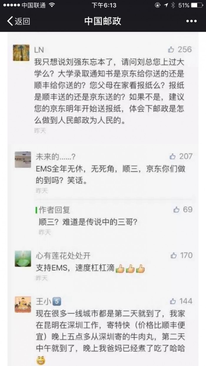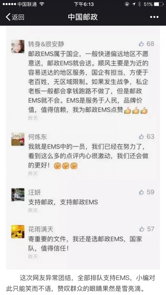 并且“此次网友非常连合,全数列队支撑EMS”,认为邮政的办事除了存心,速度上也完全不输给京东和顺丰。网友们纷纷亮相: