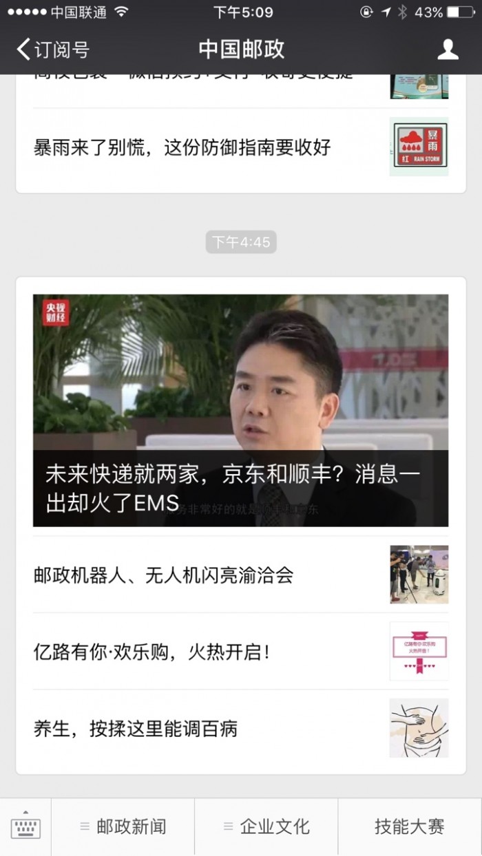 6月23日晚间动静,近日,刘强东正在接管央视财经采访时暗示能正在将来立脚国内物流的可能只要京东和顺丰。不意,这句话却引来了中国邮政的微信公家号答复,手法高超不说,还列举了浩繁网友的亮相。今天,中国最大的邮政分析办事集团——中国邮政通过微信公家号颁发了题为“将来快递就两家,京东和顺丰?动静一出却火了EMS”的文章,默默辩驳刘强东“将来快递可能只要京东和顺丰”的言论。