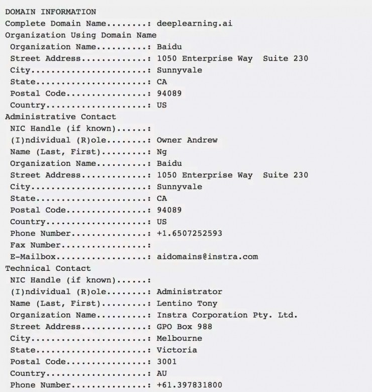 有发觉Deeplearning.ai的域名似乎已注册到百度位于硅谷森尼韦尔的研发机构,也是吴恩达此前工做过的不异的办公室。按照从Wayback Machine上获取的数据,该域名由Instra注册,并于2015-2017年之间被认领。