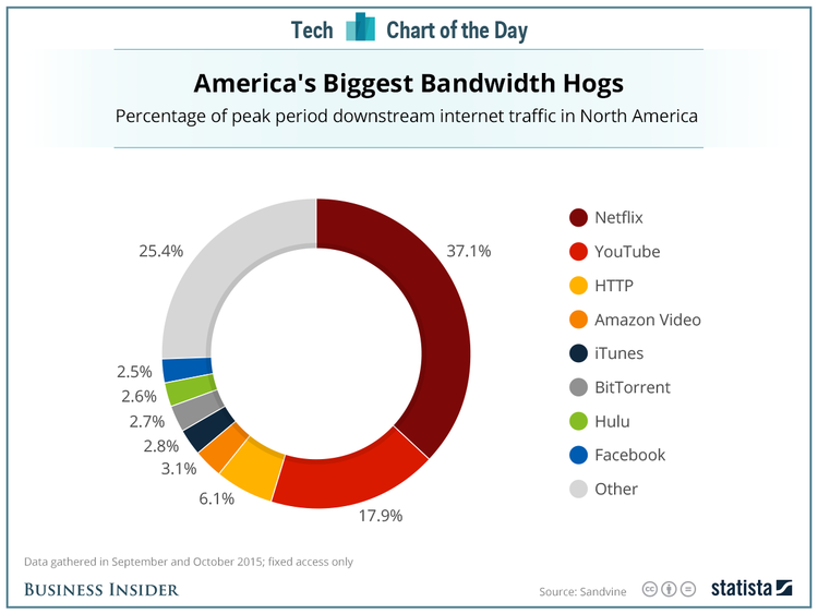 电信行业投资庞大,运营商市场凡是由某几家大公司垄断。和中国分歧的是,正在美国等国度,运营商并非国有企业,并不承担公有根本设备扶植的,而是需要自傲盈亏。互联网手艺突飞大进,Google、Netflix(全球最大的正在线视频网坐之一)等大型互联网公司,占领的运营商带宽资本日积月累。比来几年,收集流量次要都是YouTube和Netflix贡献的,比例一度高达70%。