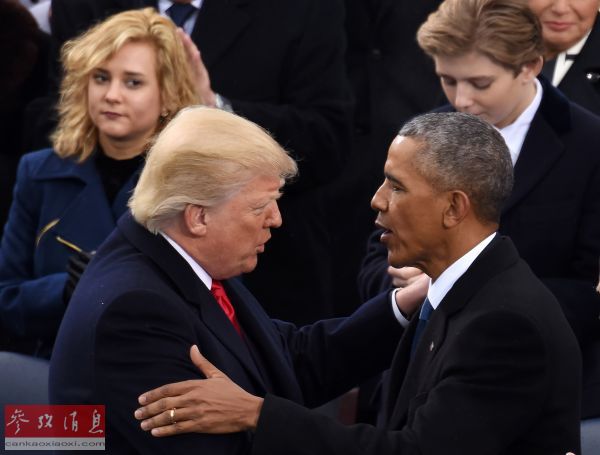材料图片:2017年1月20日,正在美国首都山,特朗普(前左)颁发就职后取前任总统奥巴马扳谈。( 殷博古 摄)