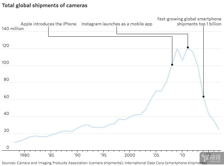 智能机让照片变得比以往更主要,它还倾覆了相机行业。相机和影像产物协会发布的数据显示,2010年到2016年期间,数码相机出货量下降80%至2400万部。此中冲击最大的一家公司是伊士曼柯达公司,这家标记性的菲林公司此前曾经遭到了数码相机的冲击。2012年,柯达颁布发表按照《美国破产法》第十一章申请破产,并沉组公司营业专注于贸易影像市场。