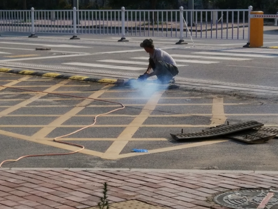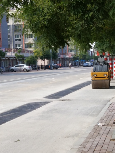 电锯摩擦着减速带,现场蓝烟弥散,本来凹陷的轨道几乎被粉碎殆尽。工人不断地向轨道里铺沥青,压机紧跟其后。
