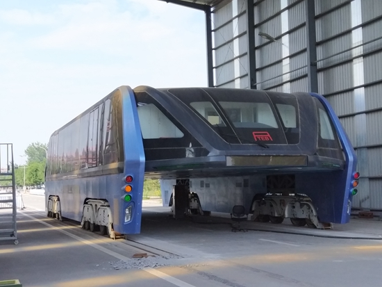 它具有蓝色的烤漆车身和流线型的车头,上半身悬空,下半身由两侧的白色钢壳支持,像一只挥舞双鳍的鳐鱼。门外汉也一眼就能大白设想者——搭载乘客,下方容车辆穿行。
