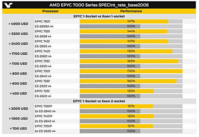 EPYC处置器将支撑最高128条PCI-E3.0,8通道DDR4内存,最高支撑2TB的内存。而按照SPEC2006的机能测试,AMD的EPYC处置器和划一定位的IntelXeon处置器比拟较的线%起步,最高端的EPYC7601领先幅度达到了47%。