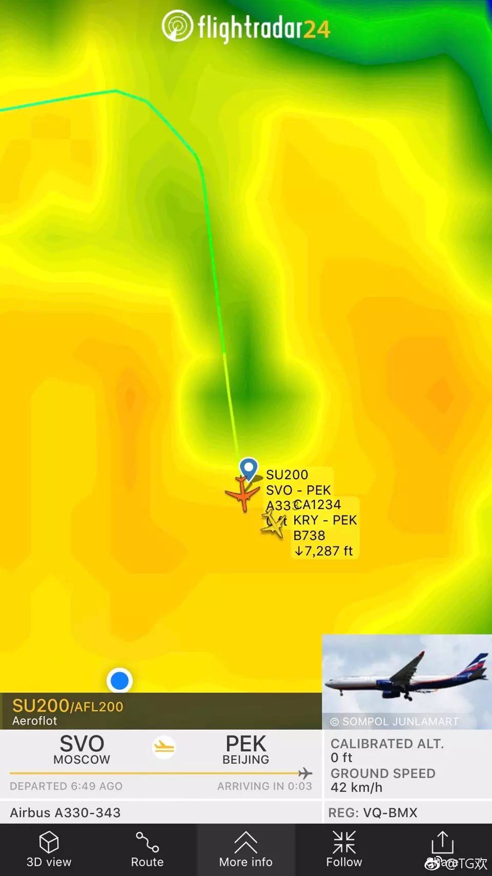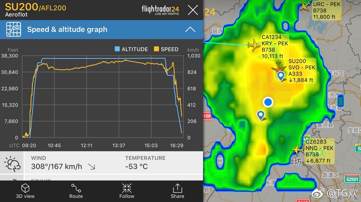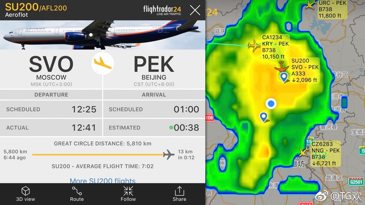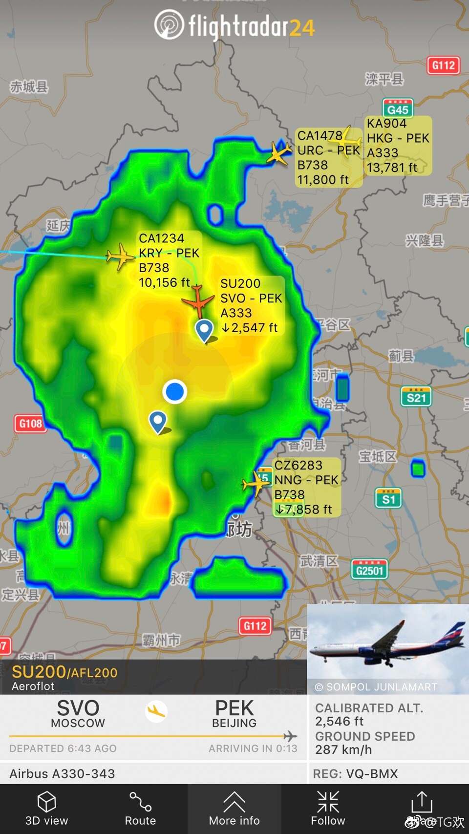 SU200,俄航每天三更十分准点呈现正在、门头沟一带上空预备下降。一度成为旧事热点的这个航班已经正在能见度低于500m的大雾霾中下降正在首都国际机场(当晚独一下降),也已经正在附近回旋几个小时死等等雾霾散去,正在燃油耗尽最初一刻平安落地(当晚独一下降),今晚这货又准时呈现正在水库上空,进入画面时高度已稳稳落到5000ft。