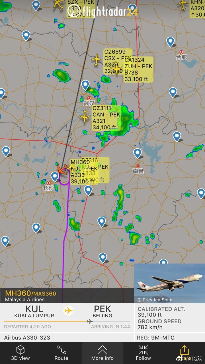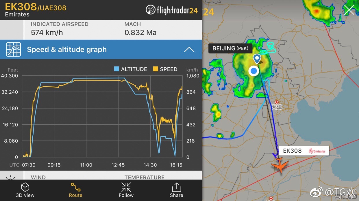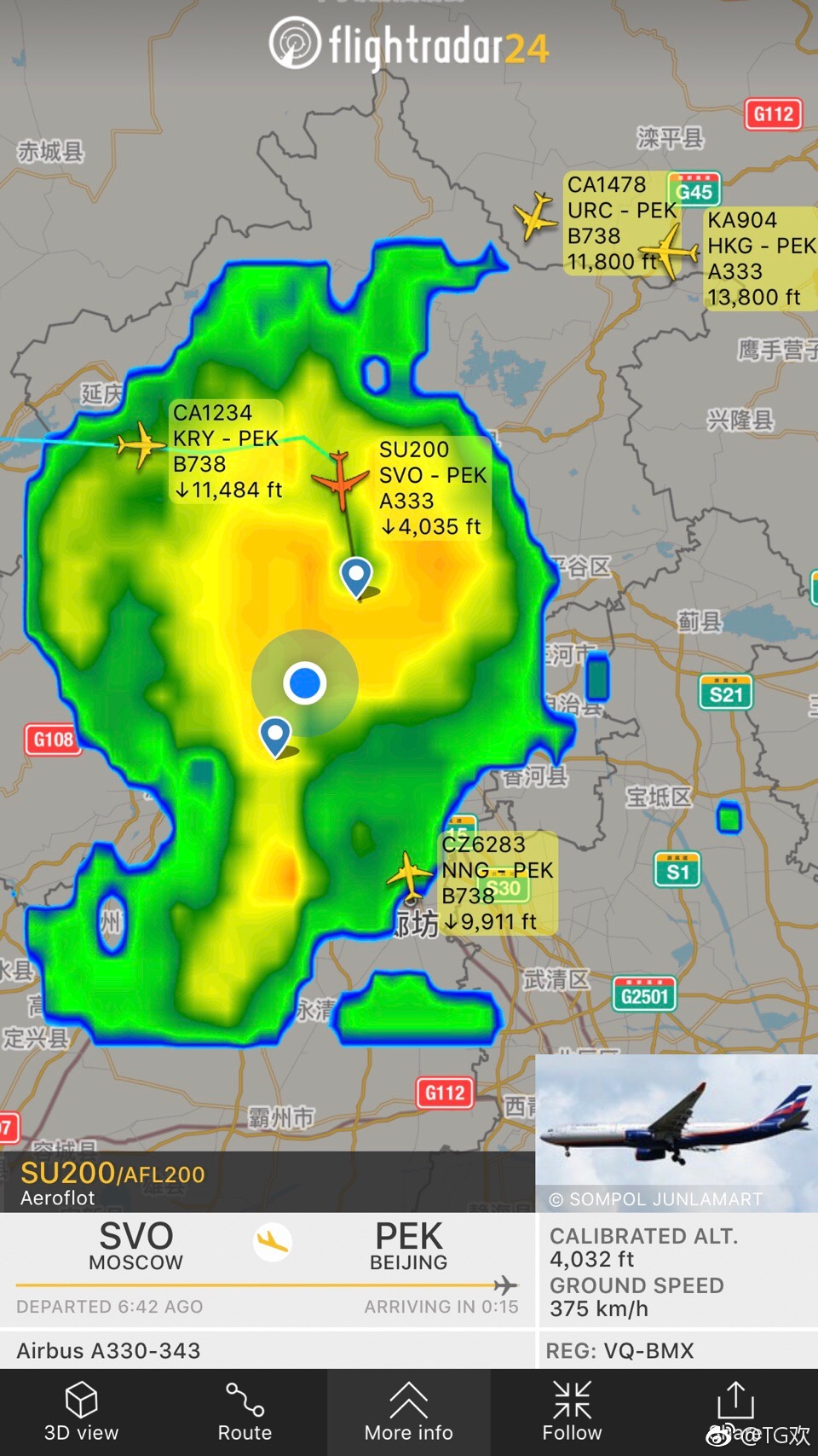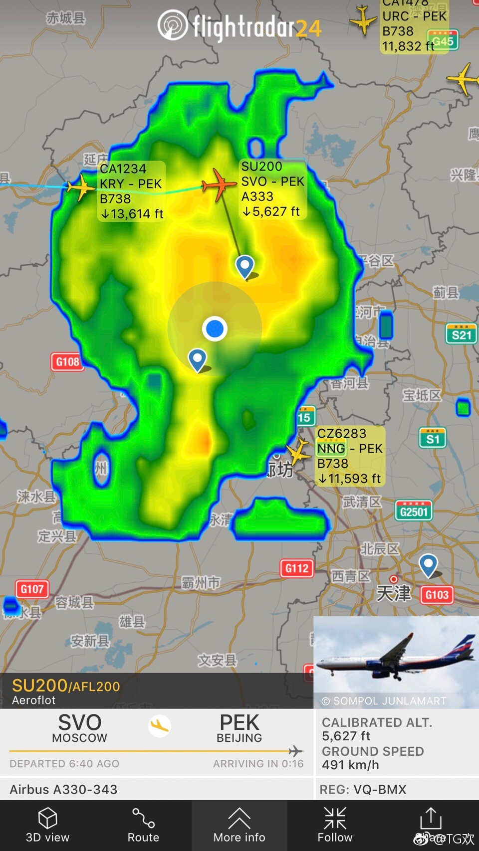 迪拜飞来的阿航大胖子380,正在机场前前后后转了两个小时,自南向北落地失败复飞,正在密云上空打了三团毛线后自北向南再降,失败又复飞。然后不干了,拉升到30000ft以上,全速往上海浦东备降去了。两层楼500号人呢,除了上海、仁川,附近也没别地儿适合款待土豪家的大胖子了。