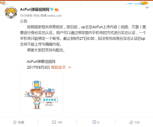 8月3日,AcFun弹幕视频网(俗称A坐)正在微博上发布声明称, 按照国度相关政筹谋定,本日起,up从正在AcFun上传内容(视频、文章)需要进行身份实名认证。