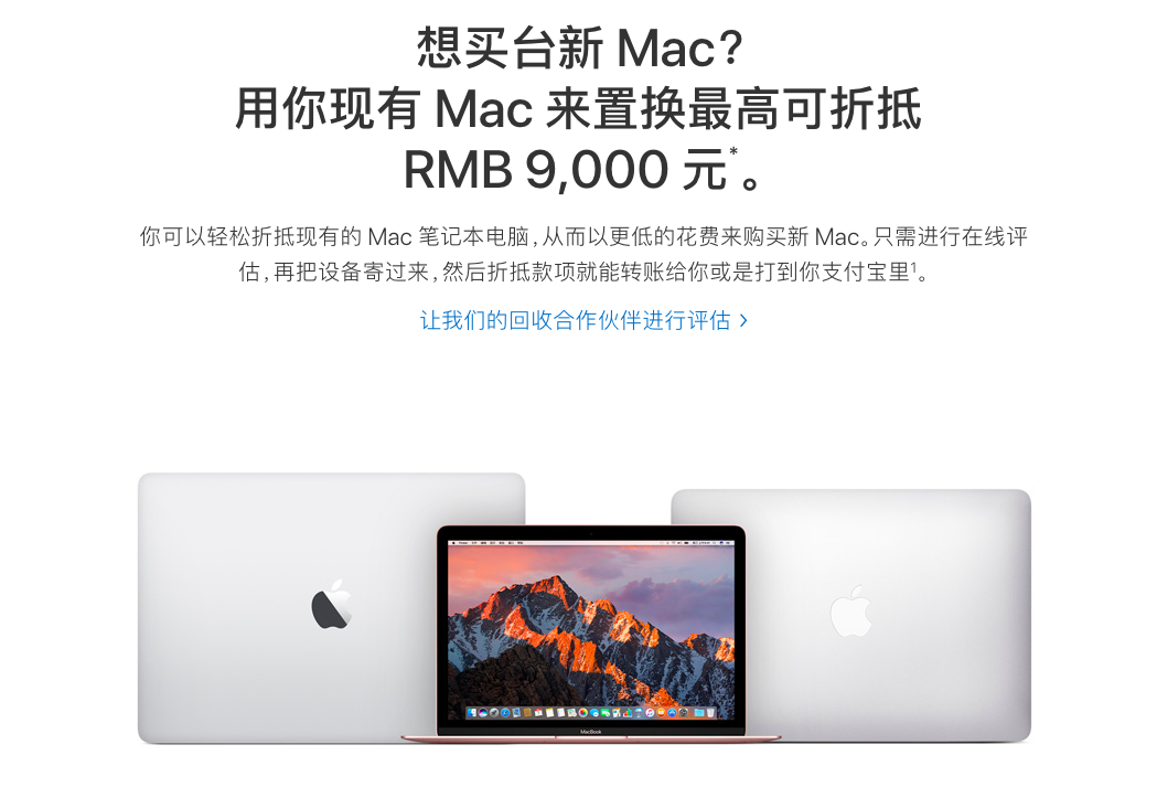 8月2 日,苹果中国正在官网正式推出了Mac的以旧换新打算。次要针对的是正在 2014-2015 年期间上市的 Mac 产物。现正在官网曾经打出了“最高可折抵 RMB 9000 元” 口号。MacBook Air 、MacBook Pro、以及 Mac 都能够通过这个项目进行置换。