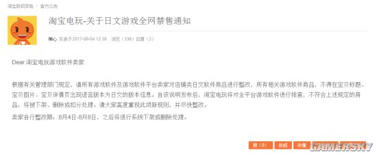 按关办理部分划定,请所有逛戏软件及逛戏软件平台卖家对店肆类日文软件商品进行整改,所有相关逛戏软件商品,不得正在宝物题目、宝物图片、宝物详情页呈现言语版本为日文的版本消息。自该申明发布后,淘宝电玩将对全平台逛戏软件进行排查,不合适上述划定的商品,将被下架、删除或扣分处置。请大师高度注沉此项新,并尽快整改。