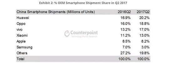 排名第2和第3的是显著增加的OPPO和vivo。OPPO出货量同比增加11.3%,vivo增加9.3%,联袂连结了高增速。