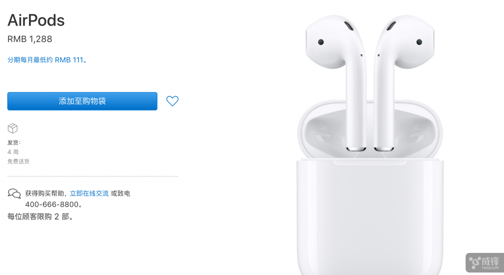 威锋网讯,自从客岁12月上市开售以来,苹果的无线AirPods的估计发货时间就一曲“坚挺”正在6周。不外今天据威锋网从苹果官网领会到,包罗中国地域正在内的很多正在线商铺,AirPods的估计发货时间曾经从6周削减至4周。