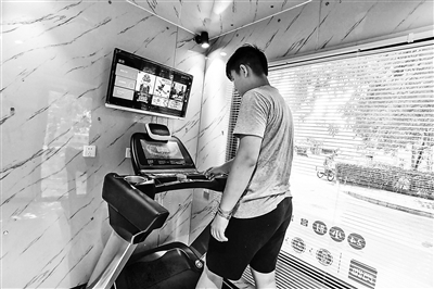 正在扫码进入该活动仓后,北青报记者看到正在仓内核心摆放着一台跑步机,周边配有镜子、挂钩、播放屏幕、温控系统、空气净化等设备,活动仓内温度适中。正在体验的过程中,用户能够通过屏幕联网聊天、听歌、不雅影、收发邮件等,较为舒服便当。跑步40分钟后,北青报记者通过觅跑APP缴费8元,其单价为0.2元/分钟。