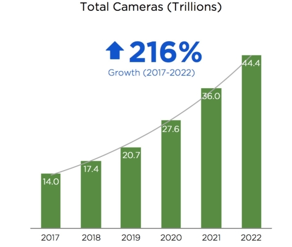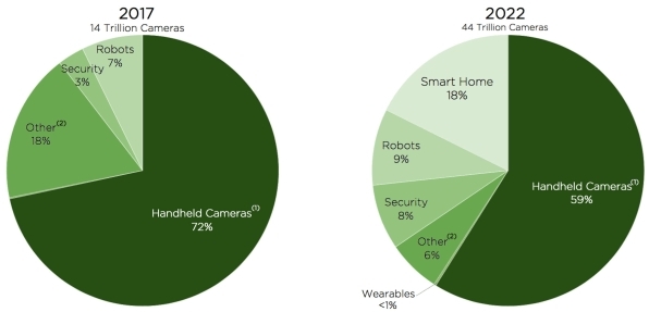 据悉,高盛等市场研究公司此前曾发布数据显示,目宿世界上的摄像头总数约为14万亿个。而按照LDV最新的研究,设置装备摆设摄像头的产物包罗机械人、安防系统以及亚马逊Echo等智能家居产物。