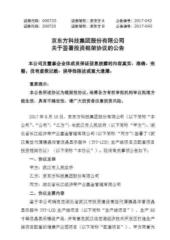8月10日,京东方取武汉市、湖北省长江经济带财产基金签订框架和谈,将正在武汉投资扶植第10.5代液晶面板出产线英寸等液晶显示模组产物,估计2017年第四时度开工、动工后两年内投产。