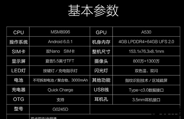 此外,新机还供给了Type-C正反插接口,支撑快充3.0,3000mAh容量电池30分钟可充50%,支撑Hi-Fi音效,0.2秒指纹识别,运转Android 6.0.1系统,支撑双卡双待全网通。