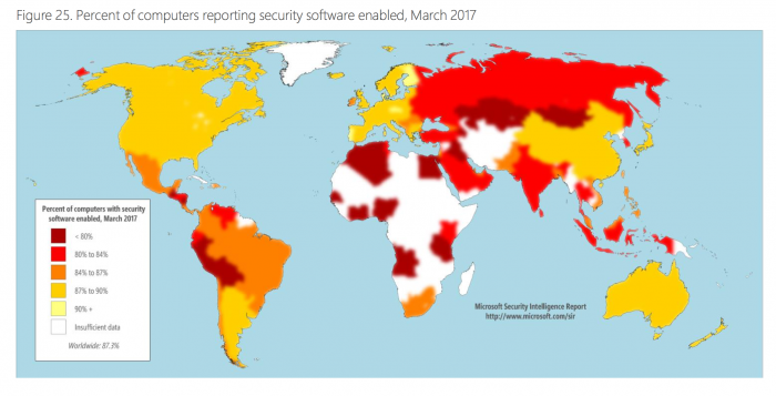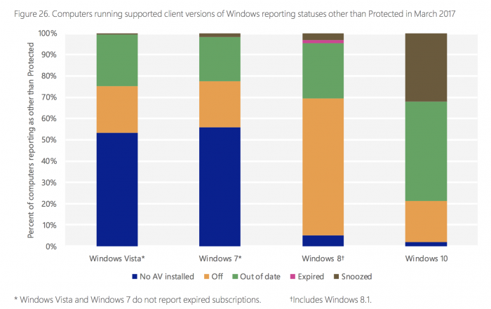 正在其最新的平安谍报中,微软透露,正在所有Windows 7电脑傍边有一半以上未安拆任何反病毒软件。从Windows 8起头,微软决定正在没有其他反恶意软件存正在的下默认启用Windows Defender,虽然如斯,大大都未受的Windows 8和Windows 8.1 PC城市封闭其反恶意软件。
