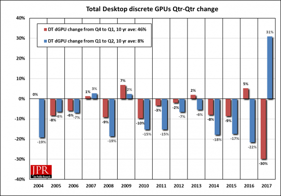 市场调研机构JPR发布的一份PC显卡出货量中显示,第二季度AMD的出货量环比增加了8%,而NVIDIA的出货量增加了10%,Intel增加6%。全球显卡的出货量同比增加6.4%,此中桌面端增加5%,挪动端增加7%。