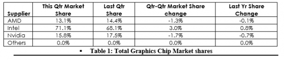 ·正在全体显卡市场份额上,AMD总出货量同比增加7.81%,Intel总出货量上涨6.31%,NVIDIA上涨10.42%