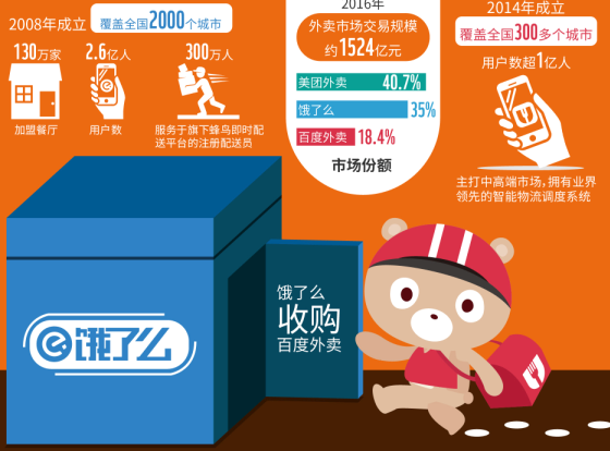 8月24日晚,饿了么颁布发表正式收购百度外卖。按照两边和谈,归并完成后,百度外卖成为饿了么的全资子公司,百度外卖仍以的品牌和运营系统成长,包罗办理层正在内的人员架构连结不变。此次收购不包含百度糯米。