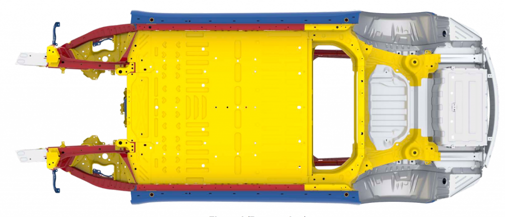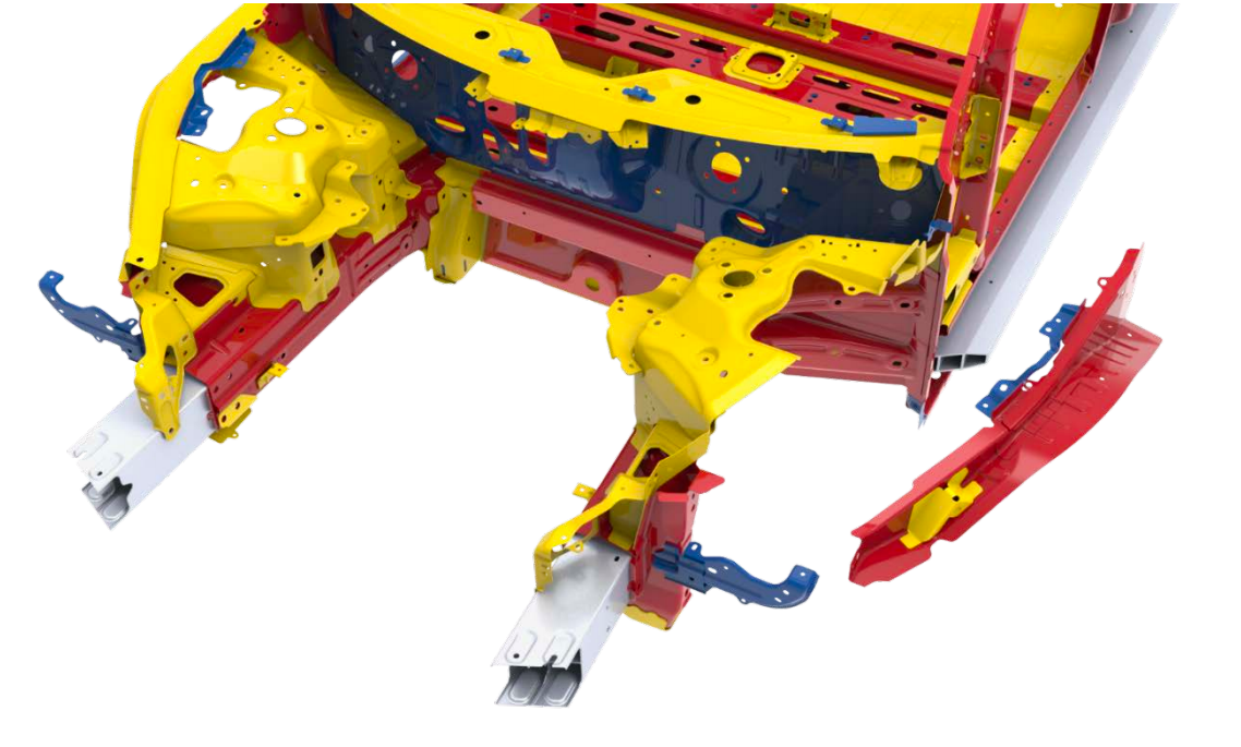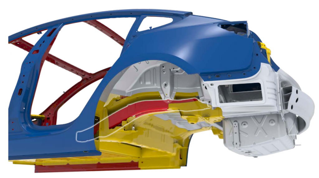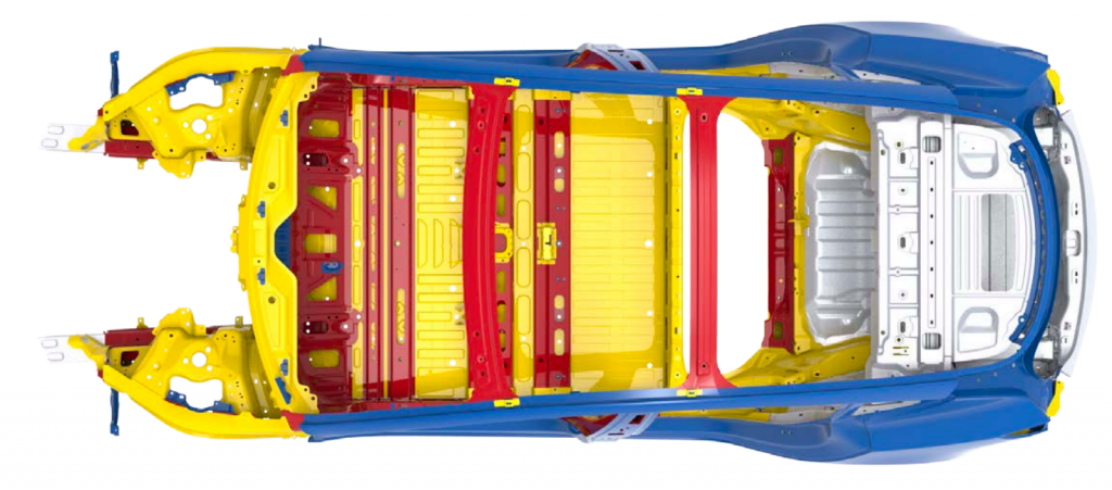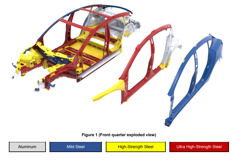 不多的铝制布局次要集在车尾,这可能是为了均衡后轴电动机带来的分量。超高强度钢集中于乘客舱,构成了数个 H 形防撞布局。