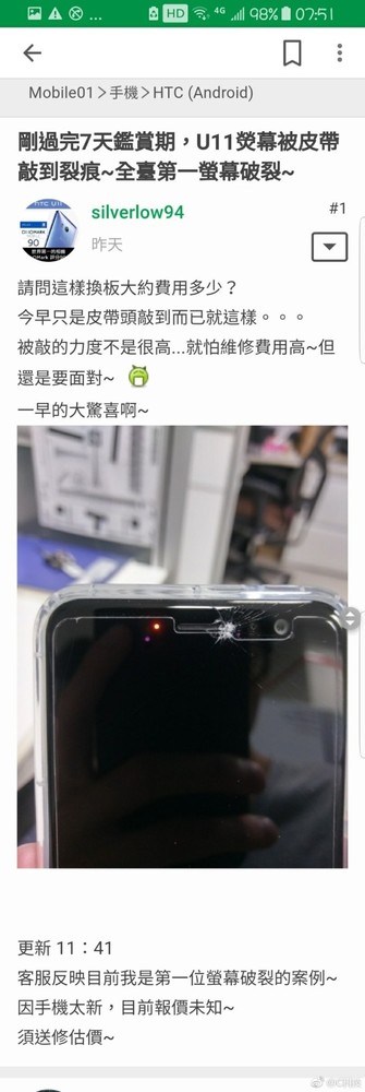 这位用户正在HTC论坛发帖暗示,它的HTC U11只是被头“悄悄敲到”,就成了图中的样子。随后客服也证明他是第一位屏幕的案例,心疼他一秒钟。我们能够看到,碎裂的部位位于听筒,成散射状,听筒部门的玻璃颠末开孔天然强度会差一些。这位用户也是命运太欠好,目前还不晓得改换屏幕要几多钱。
