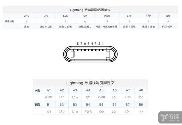 起首,我们从lightning接口的特征出发。从的图片看,此中PWR:电源;GND:地线:用来识别正背面或配件类别等ID识别选通信号;L0p/L0n/L1p/L1n:用于数据传输的信号线。