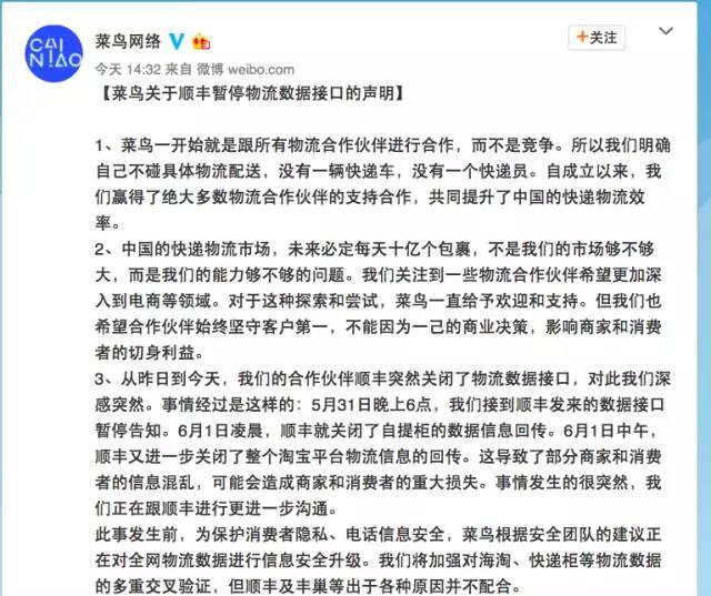本年14:30,菜鸟收集正在起微博上颁发声明,对此很俄然,正正在取顺丰告急沟通。