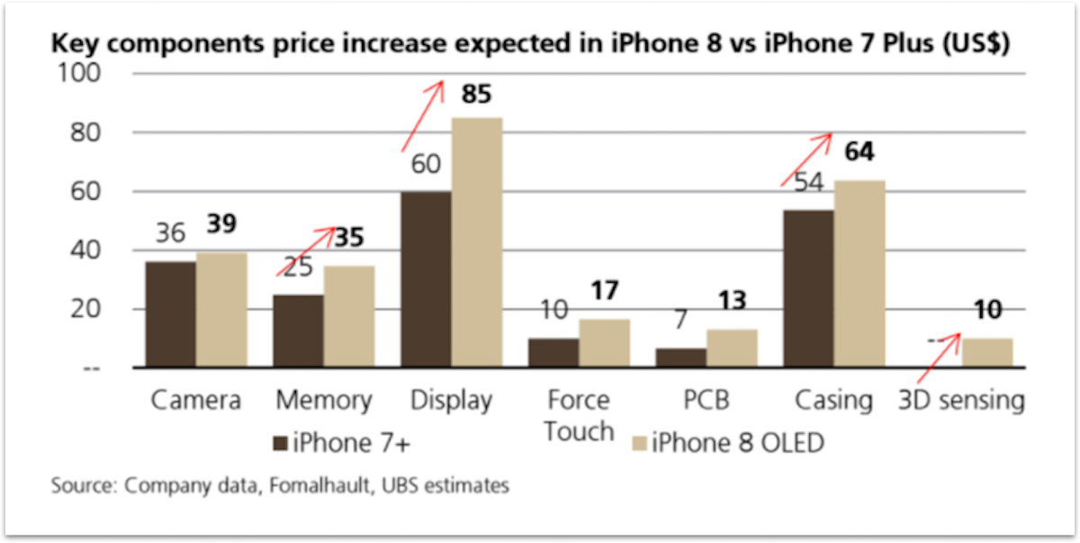 (iPhone 8 取 iPhone 7 Plus 物料成本对比,图片来历:UBS)