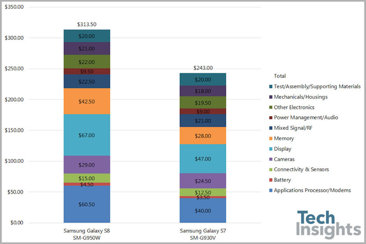(三星 S8 物料成本对比 S7,图片来历:Tech Insights)