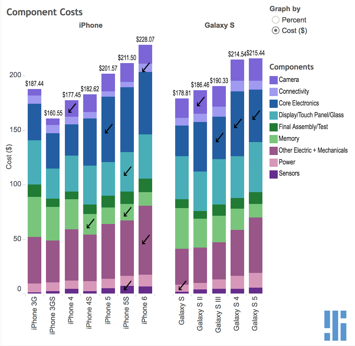 (历代 iPhone 取历代 Galaxy S 旗舰成本对比,图片来历:Teardown)