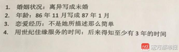对此,世纪佳缘公关部工员对南都记者说,“我们平台汇集的材料是不完美的,她(女方)供给的材料,我们会通过我们的渠道去核实,从红娘的角度,会认为她客不雅没有棍骗我们的意义,学历、身份是能够公开查证的,但婚姻消息没法子查证。事发我们也很,我们先要做的是厘清现实。”