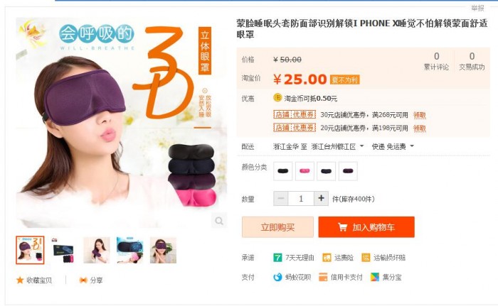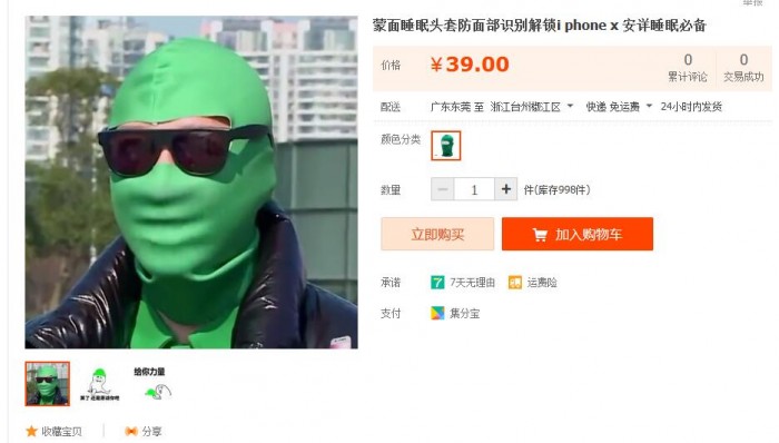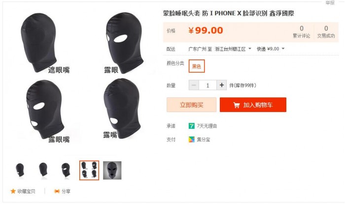 iPhone X摒弃了保守的指纹传感器功能,而是整合了更为平安的面部识别功能。然而正在发布之后这项功能遭到了浩繁网友的讥讽,称晚上睡着之后有人对着脸部一扫就成功完成转账领取等等。为了杜绝这种,全能的淘宝上就出现出了让你睡眠的蒙面产物,零售价钱为25-99元之间。