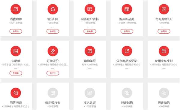 从官网页面消息来看,用户可通过完美账户消息、消费购物、绑定QQ、采办新品类、每月购物3天、晒单、订单评价、购物年限、分享商品或、利用京东领取、回覆问题等行为来提拔“京享值”。