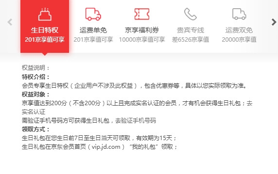 跟着“京享值”分值的不竭提拔,用户可获得的会员权益也会响应升级。具体如下: