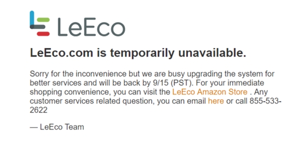 为您形成的未便,我们深感抱愧。我们正正在积极升级系统,以供给更好的办事,并会正在承平洋时间9月15日从头上线。需要顿时购物的用户,请拜候LeEco的亚马逊商铺。任何客服相关问题,请发送email,或拨打855-533-2622。